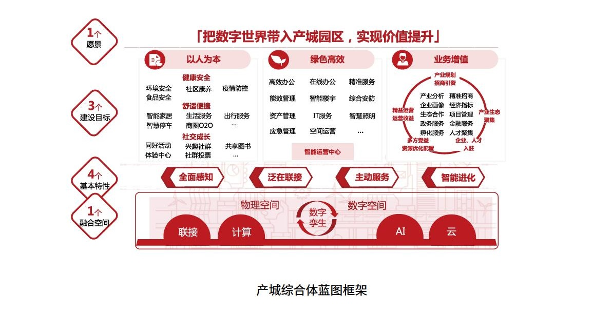 建設(shè)目標,基于以人為本、綠色高效、業(yè)務增值,可圍繞產(chǎn)城綜合體作進一步深化設(shè)計,以人為本體現(xiàn)在健康安全、舒適便捷和社交成長等;綠色高效可根據(jù)產(chǎn)城綜合體的主要業(yè)態(tài),分別從高效辦公、精準服務、智慧能效空間運營等場景展開設(shè)計;業(yè)務增值可從產(chǎn)業(yè)規(guī)劃、生態(tài)發(fā)展、資源優(yōu)化配置以及精益運營等領(lǐng)域規(guī)劃,實現(xiàn)與產(chǎn)城綜合體相匹配的智慧化服務體系和平臺支撐體系。融合空間與全面感知、泛在聯(lián)接、主動服務和智能進化等基本特征,作為支撐產(chǎn)城綜合體的基礎(chǔ),可結(jié)合產(chǎn)城綜合體承載的人機物事的具體需求進行詳細規(guī)劃。這樣我們就可以定制出指導產(chǎn)城綜合體園區(qū)智慧化規(guī)劃的完整的"1-3-4-1"藍圖框架(如圖所示)。