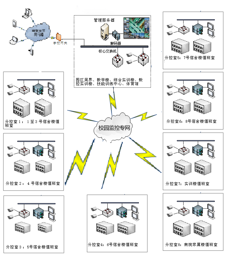 (1)分校區(qū)現(xiàn)有的監(jiān)控點(diǎn)遍布學(xué)校各個重要點(diǎn)位,包括教學(xué)樓、一體化樓、實(shí)訓(xùn)樓、辦公樓、學(xué)生宿舍、學(xué)生食堂、校內(nèi)重要場所等。通過光纖鏈路將前端各個點(diǎn)位匯聚到監(jiān)控中心,并統(tǒng)一傳到監(jiān)控中心集中存儲。