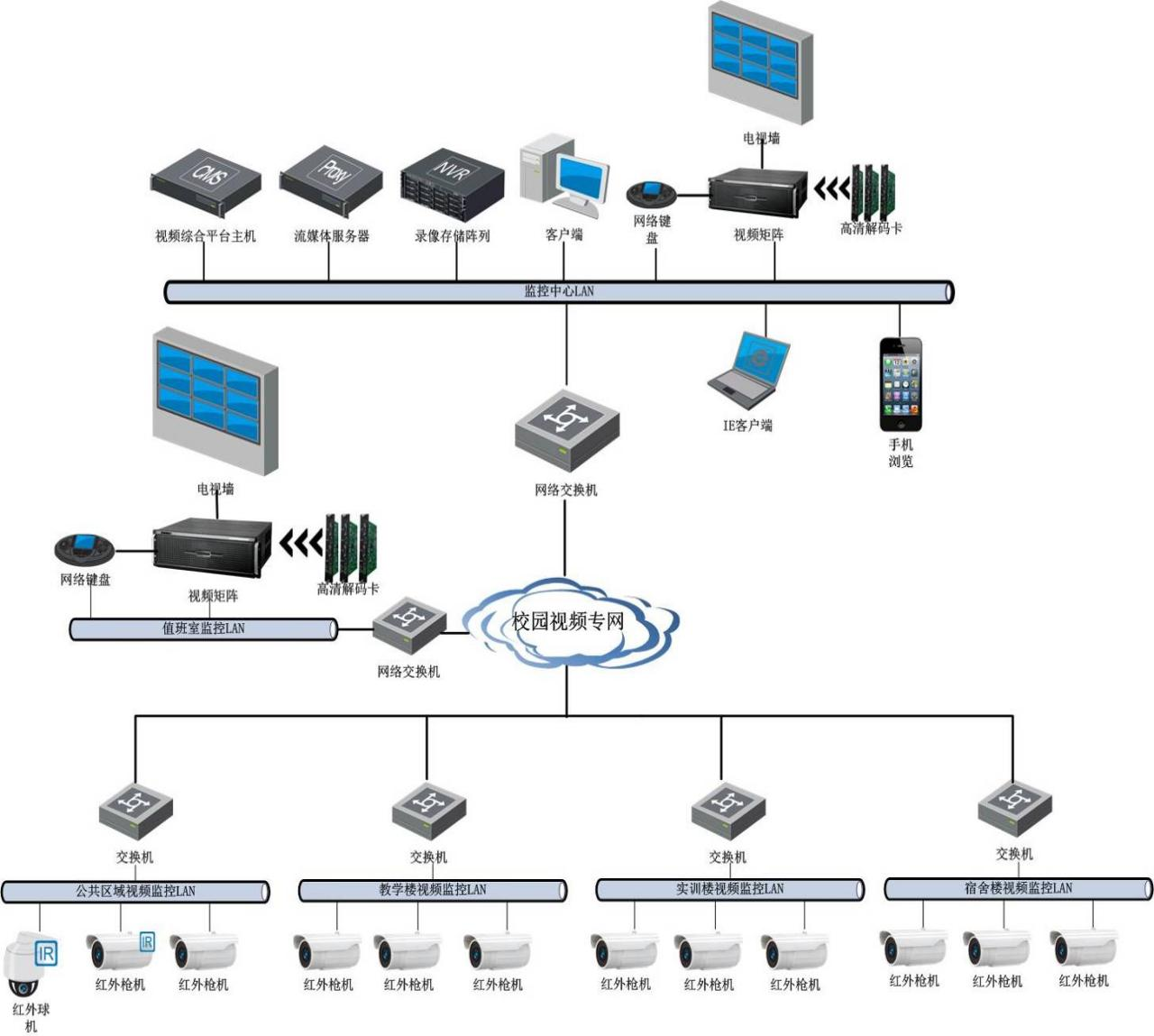 (2)分校區(qū)的網(wǎng)絡(luò)視頻監(jiān)控系統(tǒng)共分為四個層次:前端設(shè)備、網(wǎng)絡(luò)傳輸、值班室及主控中心。